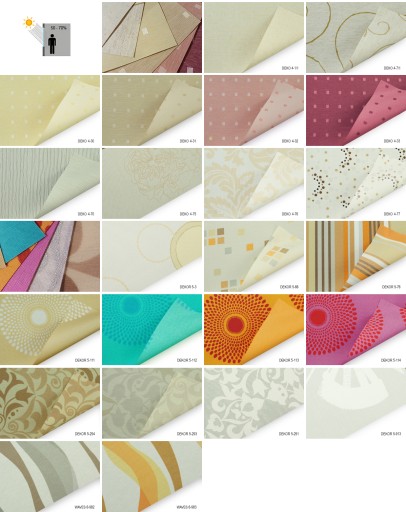 METALIC - tkanina z metaliczną posrebrzaną nicią, dobrze kryjąca. Tkanina dzięki posrebrzanej nici posiada właściwości odbijania promieni słonecznych, zapobiegając nagrzewaniu się pomieszczenia, dlatego idealnie nadaje się na poddasza oraz do zastosowania wszędzie tam, gdzie mamy nadmiar słońca. Faktura tkaniny jest gładka oraz posiada metaliczny wygląd. Jasne materiały rozświetlają pomieszczenie dlatego też odczuwalny stopień zaciemnienia przy jasnych kolorach to około 60%. Im ciemniejszy materiał tym większe zaciemnienie.