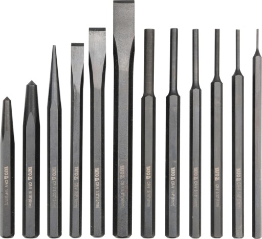 Zestaw zawiera wybijaki walcowe 1,5 , 3 , 4 , 5 , 6 , 8 mm , wybijak stożkowy 2 mm , przecinaki 10 , 13 , 16 mm, punktaki 6 mm i 8 mm . Długości od 100 do 150 mm. Narzędzia z sześciokątnego pręta stalowego CrV 6150, powierzchnia czerniona. Pakowane w pojemnik z tworzywa.
