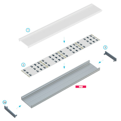Schemat złożenia elementów systemu oświetleniowego z wykorzystaniem profilu SOLIS oraz (1) klosza WIDE, (2) trzech taśm LED, (3) zaślepki bez otworu, (3a) zaślepki z otworem