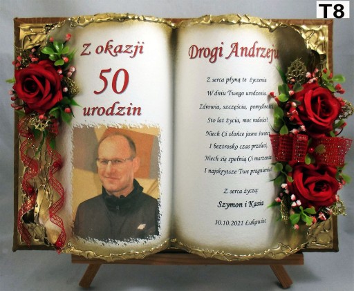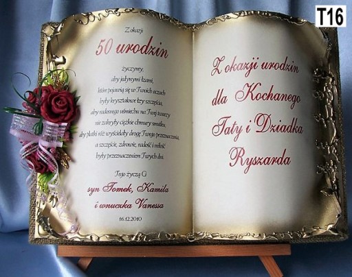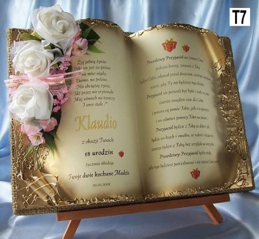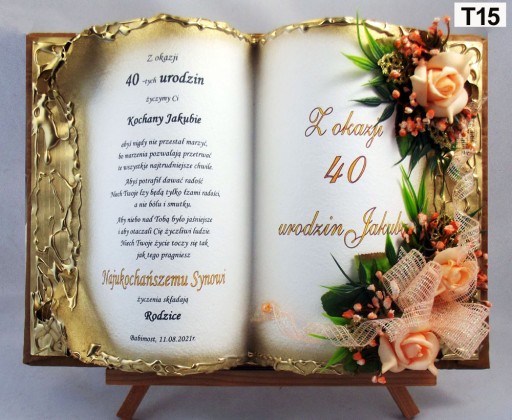 w formie księgi okolicznościowej którą wykonujemy całkowicie ręcznie techniką kolażu dekoracji przestrzennej - rękodzieło artystyczne, pięknie opakowanej , na której na głównej stronie umieszczamy spersonalizowany tekst życzeń z okazji URODZIN - imię Solenizanta, datę Urodzin, ew. miejscowość oraz w podpisie kto życzenia składa. Ozdabiamy całość piękną przestrzenną kompozycją z kwiatów materiałowych.