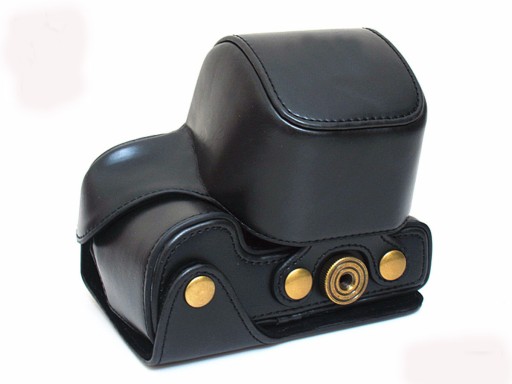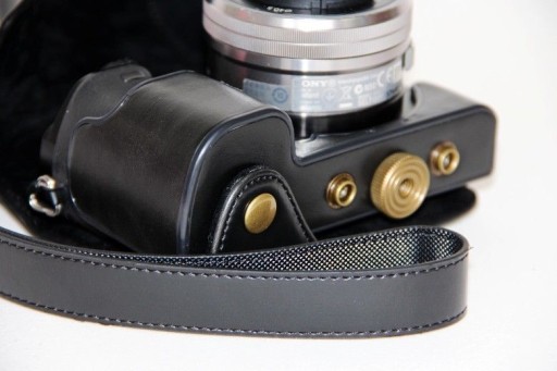 Skórzane etui z osłoną obiektywu, które chronią aparat i obiektyw, pozwalając jednocześnie na szybkie robienie zdjęć.