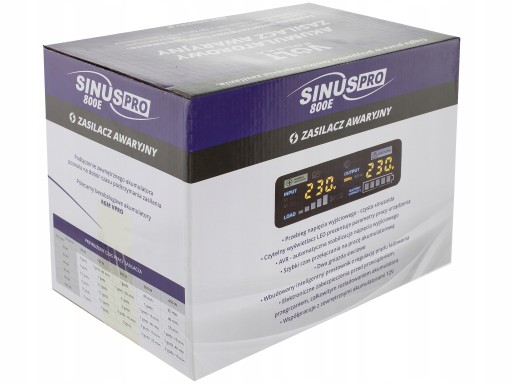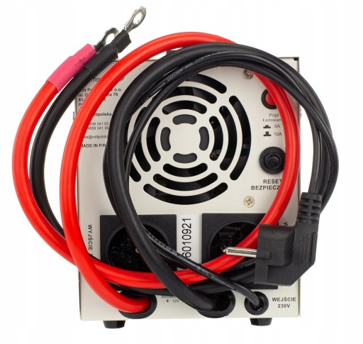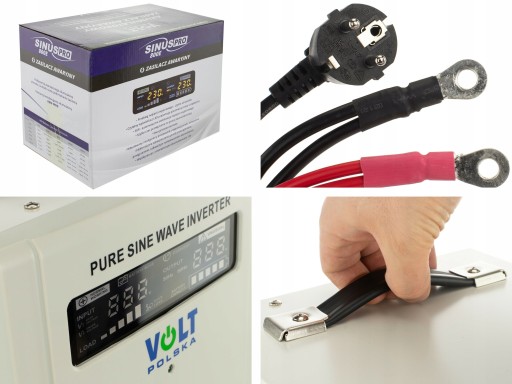 - Wyposażony w dwa gniazda 230V, wyświetlacz LCD oraz kabel połączeniowy do akumulatora