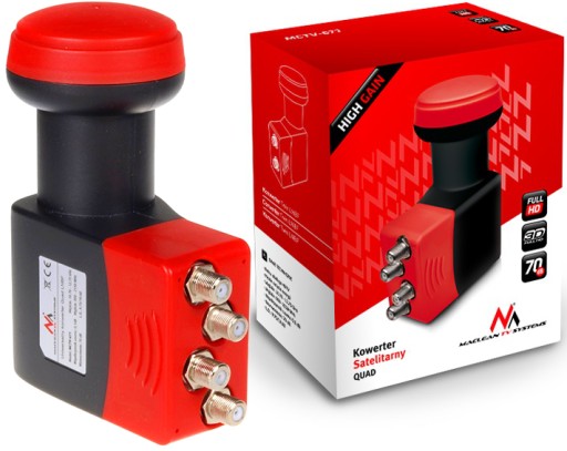 Wysokiej jakości, uniwersalny konwerter satelitarny Quad ( LNB ) MCTV-671 o wsp. szumów 0,1dB. Umożliwia podłączenie dwóch odbiorników satelitarnych lub jednego odbiornika SAT z nagrywarką i dwoma niezależnymi głowicami (wejściami LNB) np.: dekoder telewizji n, n-box recorder. Bardzo dobrze sprawdza się w instalacjach SAT multiroom (Telewizja n, Cyfra +, Cyfrowy Polsat)