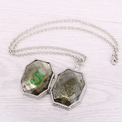 Naszyjnik wzorowany na oryginalnym filmowym medalionie Salazara Slytherina. Duża, masywna zawieszka jest złożona z dwóch części, zamykanych na magnes. Do środka można wkleić np. zdjęcie bliskiej osoby. Łańcuszek i zawieszka są wykonane z metalu koloru srebrnego, zawieszka zdobiona przezroczystą żywicą o szmaragdowym odcieniu, długość łańcuszka ok. 50cm, długość medalionu z uchwytem ok. 6cm, szerokość złożonego medalionu ok. 3,5cm.