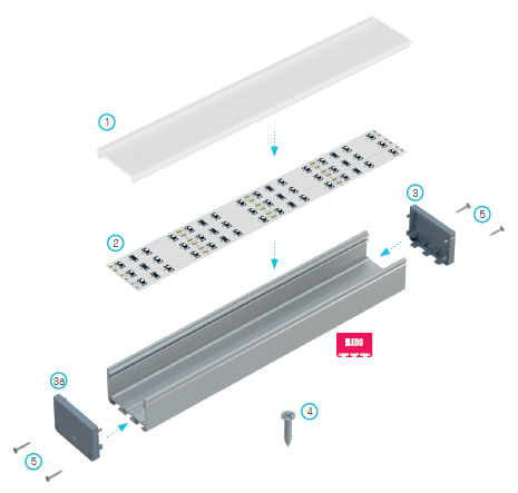 Schemat złożenia elementów systemu oświetleniowego z wykorzystaniem profilu ILEDO oraz (1) klosza WIDE, (2) trzech taśm LED, (3) zaślepki bez otworu, (3a) zaślepki z otworem, (4) wkrętu montażowego, (5) wkrętów mocujących zaślepki