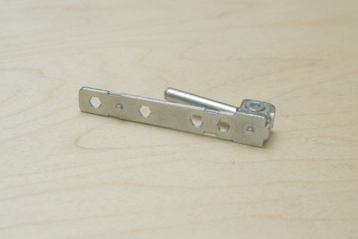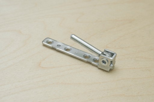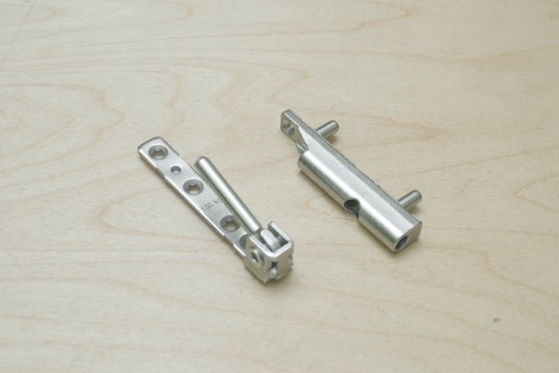 Opis: zawias wykonany jest z metalu ocynkowanego. Jest to zawias okienny dolny. Część dolna zawiasu przykręcana jest do ramy okna za pomocą 4 wkrętów a część górna zawiasu przykręcana jest do skrzydła okna za pomocą 2 wkrętów. Dodatkowo dolna część zawiasu posiada 2 niewielkie bolce ustalające położenie zawiasu jak i przeciwdziałające opuszczaniu się zawiasu. Górna cześć zawiasu również posiada 2 masywne bolce ustalające położenie zawiasu jak i przeciwdziałające obwieszaniu się skrzydła. Zawias tego typu jest stosowany najczęściej w oknach PCV. Zawias przeznaczony jest do skrzydła o maksymalnej wadze 130 kg. Zawias umożliwia regulację okna w poziomie +/- 2 mm (dolna część zawiasu) oraz w pionie +/- 2 mm (górna część zawiasu).