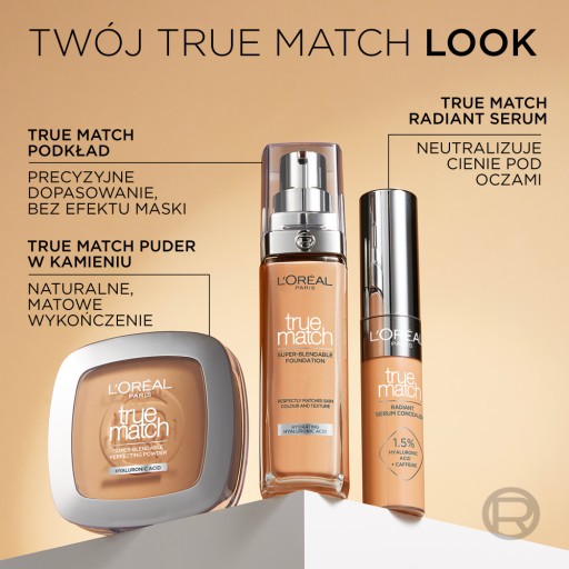 True Match to pierwszy tak doskonale dopasowujący się podkład od L`Oréal Paris. Szeroka gama odcieni pozwoli na dobranie odpowiedniego koloru do swojej karnacji. Udoskonalona formuła z olejkami eterycznymi i składnikami nawilżającymi dopasowuje się do kolorytu i struktury skóry.