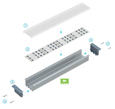 Schemat złożenia elementów systemu oświetleniowego z wykorzystaniem profilu INSO wpuszczanego oraz (1) klosza WIDE, (2) trzech taśm LED, (3) zaślepek końcowych, (4) wkrętów mocujących zaślepki