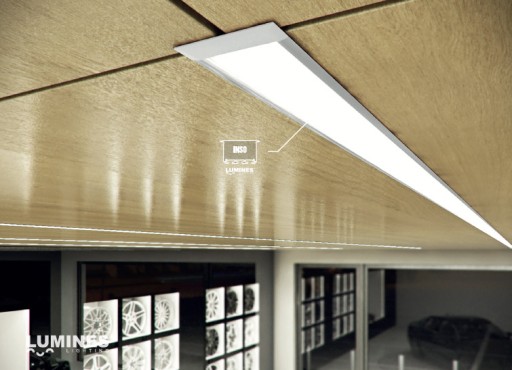 Efekt końcowy montażu profilu INSO z kloszem WIDE wpuszczonego pomiędzy płytami przy pomocy sprężyn montażowych