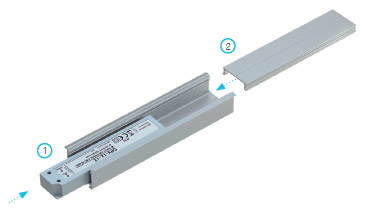 Schemat złożenia elementów systemu oświetleniowego przy wykorzystaniu profilu INSO wpuszczanego oraz (1) zasilacza LED, (2) profilu montażowego MODI