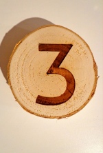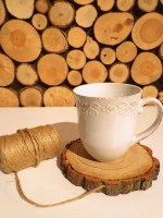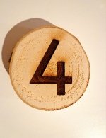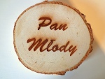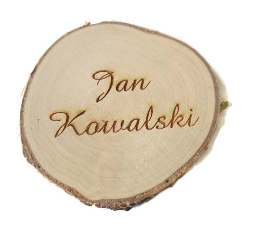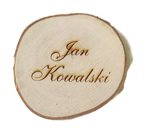Drewniane plastry brzozowe dwustronnie szlifowane z laserowo grawerowanymi napisami.