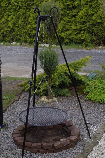 Grill trójnóg o wysokości 210 cm z regulacją wysokości rusztu NA KORBKĘ . Malowany farbą proszkową na temperaturę 400 stopni w kolorze czarnym.