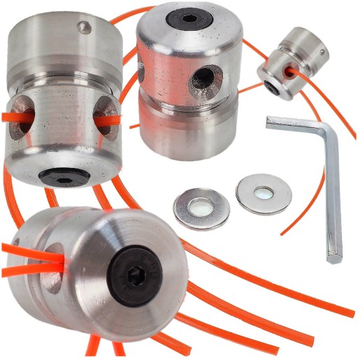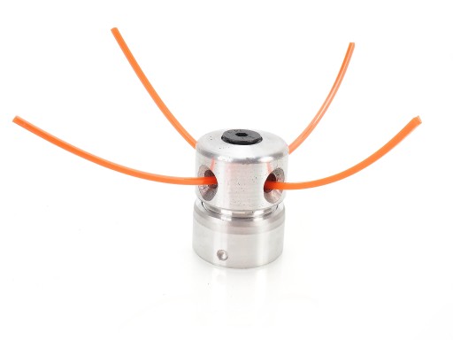 - Głowica bardzo prosta w montażu - Stosuje się ją jako zamiennik typowej tarczy do kosy. Aby zamontować głowicę należy rozkręcić ją w połowie i przymocować górną część do przekładni kątowej nakrętką lewoskrętną (brak w zestawie). Po przymocowaniu do przekładni nakręcamy drugą część głowicy i możemy już przełożyć żyłkę przez oczka dociskając je imbusem aby mocno się trzymały.