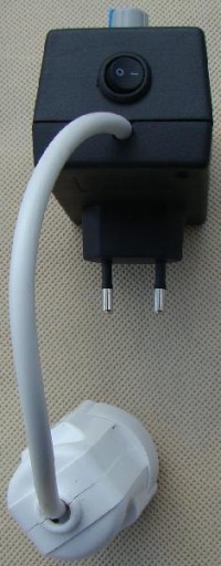 Działanie jest bardzo proste. Po pojawieniu się napięcia zasilania 230VAC sterownik zaczyna odmierzać czas (ustawiany potencjometrem) – w czasie odmierzania czasu pali się czerwona dioda led a na wyjściu brak jest zasilania (przełącznik na obudowie w pozycji „1”). Po odmierzeniu zadanego czasu odbiornik zostanie włączony na stałe , zgaśnie czerwona dioda led i zapali się zielona dioda. Diody są wewnątrz obudowy – widoczne przez boczny otwór wentylacyjny obudowy.