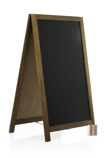 Potykacz reklamowy dwustronny, wykonany jest z płyty HDF służącej jako tablica kredowa oraz drewnianej ramki, dwukrotnie malowanej farbą; kolor - ciemny brąz. Potykacz posiada łańcuszek zabezpieczający przed rozłożeniem.