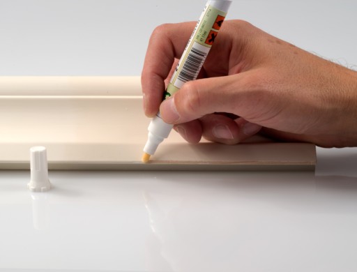 Pisak z farbą kryjącą, szybkoschnący, wodoodporny, nieścieralny, odporny na promienie UV. Idealny do barwienia krawędzi płyt laminowanych ( wypełnia drobne wyszczerbienia ). Stosowany do retuszu uszkodzeń na powierzchniach z drewna, laminatów, tworzyw szt