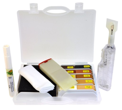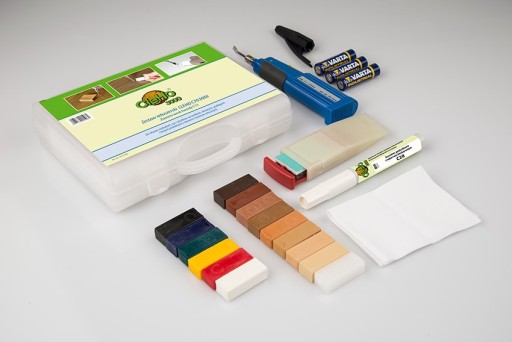 Zestaw do retuszu uszkodzeń na powierzchniach meblowych i drzwiach wykonanych z laminatu, lakierowanego forniru oraz lakierowanego drewna. Optymalny do napraw głębszych rys, małych ubytków, wgnieceń lub uszkodzonych krawędzi. Zestaw zawiera 10 sztabek wosku twardego ( w odcieniach drewna ) oraz wszystkie niezbędne narzędzia do wykonania retuszu. Zestaw wzbogacony o lakier zabezpieczający w pisaku pędzelkowym.