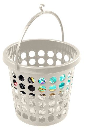 Koszyk na klamerki do bielizny z 24. klamerkami w środku. Otwory po bokach zapewniają odpływ wody w czasie deszczu. Uchwyt z haczykiem do zawieszenia na lince z ubraniami.