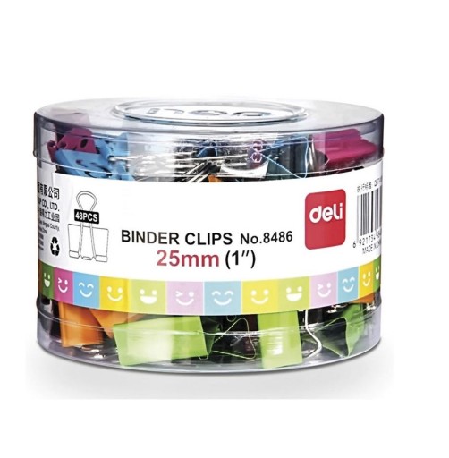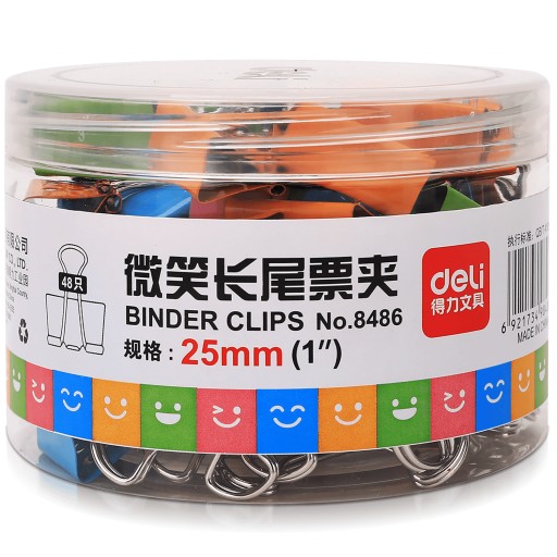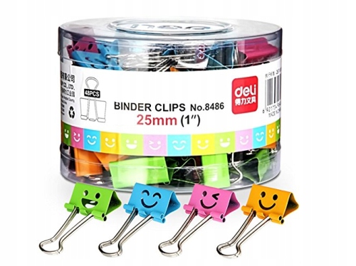 Klipy do dokumentów marki Deli zapakowane w plastikowy pojemnik, który pomieści ich aż 48 sztuk. Klipsy o długości 25mm, zakończone uśmiechniętymi buźkami. Klipsy doskonale sprawdzą się w twoim biurze czy szkole, posiadają mocne spięcie, dzięki któremu masz pewność, że zawsze zepną ważne dla ciebie notatki. Kolorowe zakończcie główek klipsa sprawia, że możesz w swobodny sposób posegregować ważne i mniej ważne dokumenty oraz utrzymać porządek w dokumentacji. Klipsy idealnie pasują do segregatorów, zeszytów oraz luźnych notatek. Produkt został wykonany z wysokiej jakości stali nierdzewnej, są bardzo miłe w dotyku i łatwe w użytkowaniu.