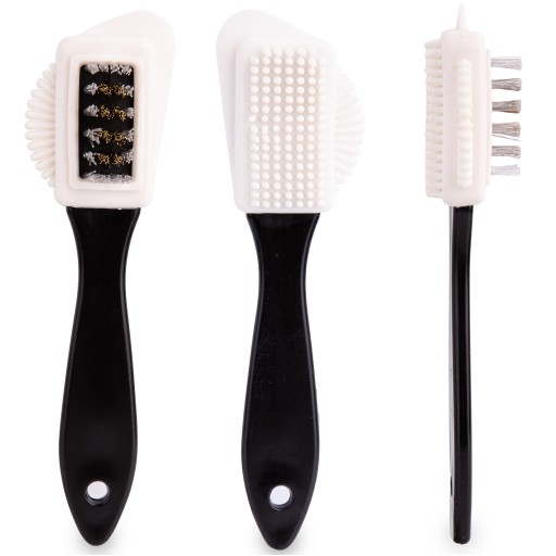 Szczotka została wyposażona w trzy rodzaje końcówek: gumowe wypustki do odświeżania zamszu, nylonowe włosie do delikatnego czyszczenia oraz mosiężne druciki do usuwania trudniejszych zabrudzeń. Takie połączenie pozwala skutecznie czyścić różne rodzaje materiałów bez ich uszkadzania.