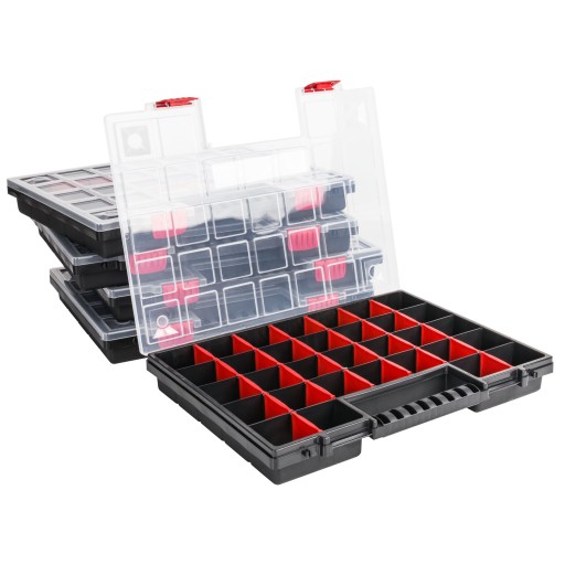 Uniwersalny organizer z serii NORS o regulowanych przegródkach, których wielkość i ilość można łatwo dostosować do swoich aktualnych potrzeb. Dzięki transparentnej pokrywie zawartość organizera jest zawsze doskonale widoczna i łatwo dostępna, a mocna rączka pozwala bez trudu przenieść organizer w inne miejsce.