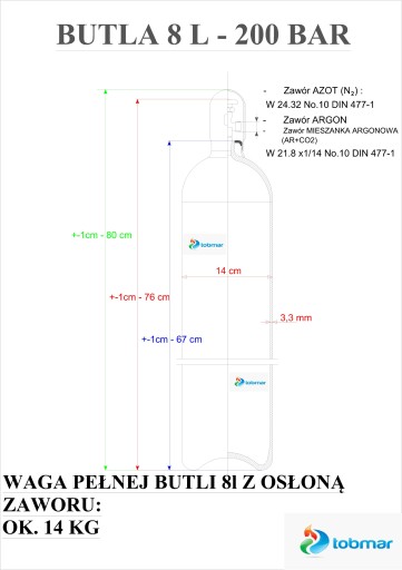 - Wysokość butli bez osłony zaworu - 76 cm (+- 1cm)