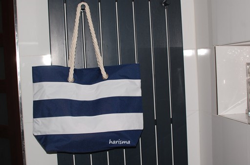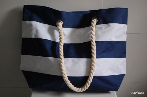 Torba plażowa Sylt w paski w marynistycznym stylu, przestronna komora główna zamykana na rzep, wewnątrz dodatkowa kieszonka na zamek błyskawiczny, 2 sznurkowe uchwyty wykonane z bawełny z metalowymi oczkami