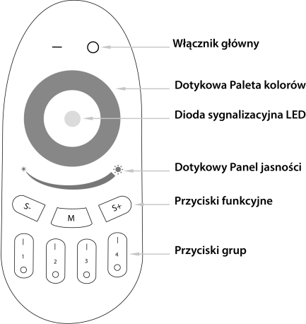 Funkcje sterowania w głównej mierze zależą od modelu urządzenia nadawczego. Umiejscowiona na środku pilota tarcza dotykowa odpowiada w głównej mierze za sterowanie oświetleniem. To właśnie dzięki można zmienić kolor światłą lub jasność oświetlenia LED. Przyciski w górnej części urządzenia pełnią rolę włącznika/wyłącznika wszystkich dostępnych stref instalacji LED. Z kolei przyciski ułożone obok siebie w dolnej części pilota wyłączają lub włączają konkretną strefę. Ergonomiczna budowa pilota pozwala w prosty i wygodny sposób sterować oświetleniem. Wszystko to możliwe jest dzięki intuicyjnemu rozmieszczeniu przycisków.
