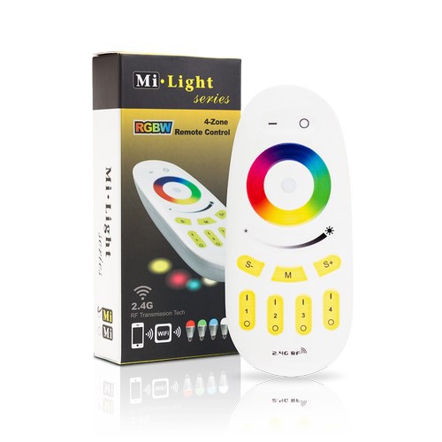4-strefowy pilot radiowy LED Wi-Fi FUT096 marki Mi-Light, który współpracuje z diodami RGB (wielokolorowymi) oraz RGB+W (wielokolorowymi z dodatkową barwą białą) dając możliwość sterowania światłem LED w różnych grupach.