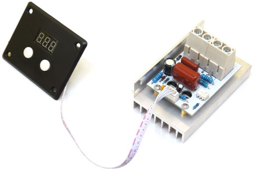 Regulator składa się z dwóch modułów połączonych taśmą elektryczną. Panel sterujący wyposażony jest w przyciski do regulacji cyfrowej wartości mocy. Mamy do dyspozycji plus i minus. Regulujemy ze skokiem 1% w zakresie od 0 do 100%. Na cyfrowym wyświetlaczu LED prezentowana jest zadana wartość. Moduł wykonawczy umieszczony na osobnej płytce drukowanej wyposażone w aluminiowy radiator do odprowadzania ciepła. Regulator posiada 4 zaciski do przykręcenia przewodów: 2 zaciski wejściowe, oraz 2 zaciski wyjściowe do podłączenia odbiornika którego będziemy regulować moc.