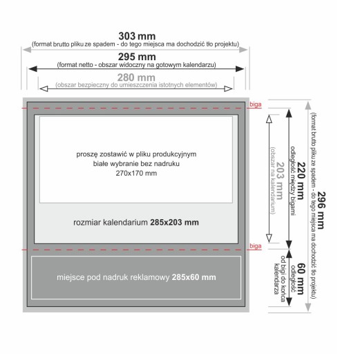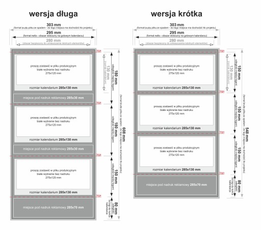 Całkowity rozmiar kalendarza to 295mm x 740mm gdy nadruk jest w dolnej części kalendarza, lub 295mm x 820mm w przypadku nadruku na całych plecach.