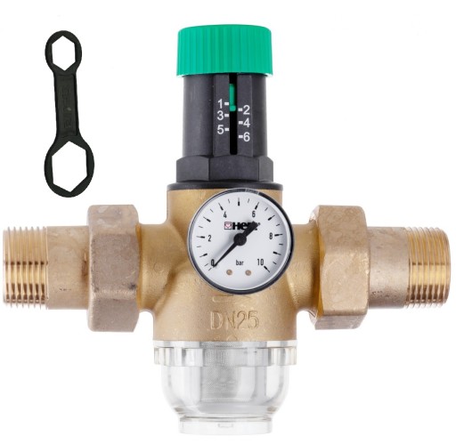 Membranowy reduktor ciśnienia przeznaczony jest do zabezpieczenia instalacji przed nadmiernym ciśnieniem (zmniejsza ciśnienie na wejściu do poziomu ciśnienia roboczego). Może być również stosowany w systemach ogrzewania w celu ochrony kotła przed wzrostem ciśnienia. Ciśnienie wyjściowe jest regulowane i nie ulega zmianie wraz ze zmianą ciśnienia wejściowego. Regulacji dokonuje się przez obracanie zielonym pokrętłem. Obracając pokrętło w lewo, zwiększa się ciśnienie wyjściowe. Obrócenie pokrętłem poza zakres nastaw na reduktorze może spowodować jego uszkodzenie. Zalecamy maks. ciśnienie wyjściowe 4 bar dla instalacji domów jednorodzinnych (długa żywotność, niższe koszty). Przy każdym nowym ustawieniu ciśnienia wyjściowego, odbiór wody powinien być otwarty i zamknięty.