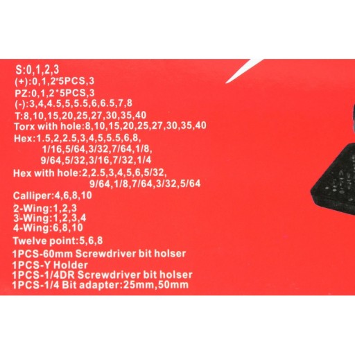 - Torx: 8, 10, 15, 20, 25, 27, 30, 35, 40