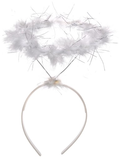 Aureola jest na druciku, można ją regulować. Ozdobiona jest prawdziwymi piórkami w kolorze białym.