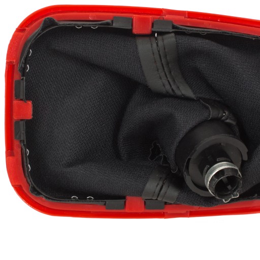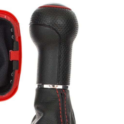 Kolor: mieszek czarny z czerwoną ramką, gałka czarna, nakładka czarna z czerwonym pierścieniem i białym schematem 5 biegów + R