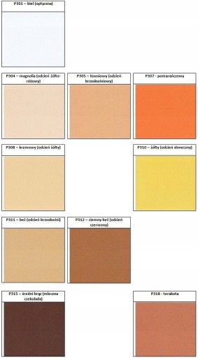 Grupa E, P, T - tkanina gładka, grubość 190gr. Przenikalność światła od 15% (kolory ciemne) do 25% (kolory jasne)