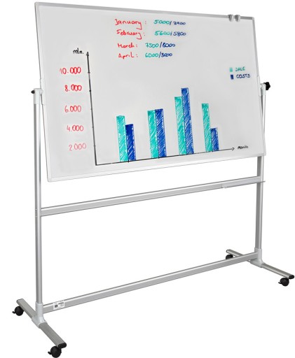 Dwustronna biała tablica o powierzchni suchościeralnej z właściwościami magnetycznymi pozwala na przyczepianie arkuszy czy zdjęć za pomocą magnesów. Tablica obraca się wokół osi poziomej, można ją zatrzymać w dowolnym momencie dzięki grafitowemu pokrętłu. Rama tablicy wykonana jest z anodowanego aluminium i wykończona została popielatymi estetycznymi narożnikami. Mobilna aluminiowa konstrukcja tablicy jest bardzo wytrzymała i stabilna. Pozwala na bezproblemowe przemieszczanie produktu. 4 kółka wyposażone zostały w hamulec.