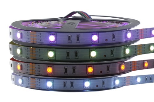 - Multikolor - LED kolorowy może świecić każdą barwą - czerwonym, niebieskim, zielonym, mieszanką tych barw oraz białym zimnym. Kolor biały w taśmach RGB uzyskujemy mieszając barwę czerwoną, zieloną i niebieską wciskając na pilocie przycisk W lub biały.