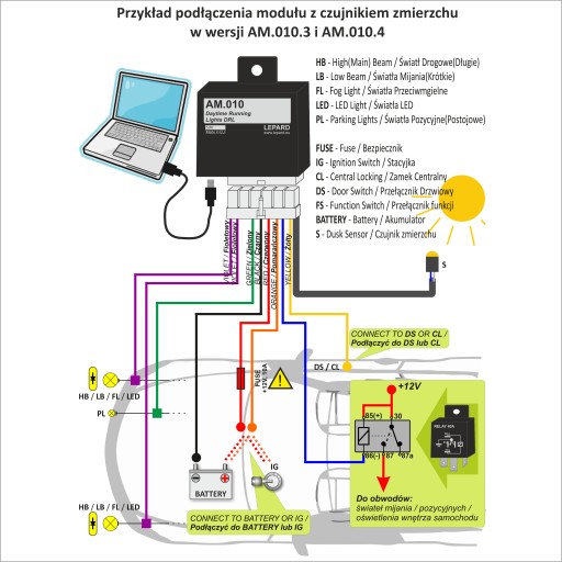 - Zapalnie i gaszenie świateł po wykryciu pracy silnika lub po wykryciu przekręcenia stacyjki z zadanym opóźnieniem.