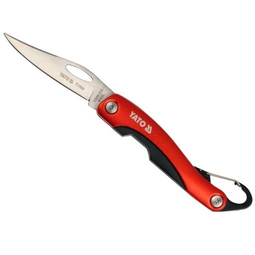 ✅ Lekki nóż składany YATO z ostrzem typu ‘bowie’ ze stali nierdzewnej o długości 75 mm, korpus metalowy anodyzowany zakończony dużym karabińczykiem.