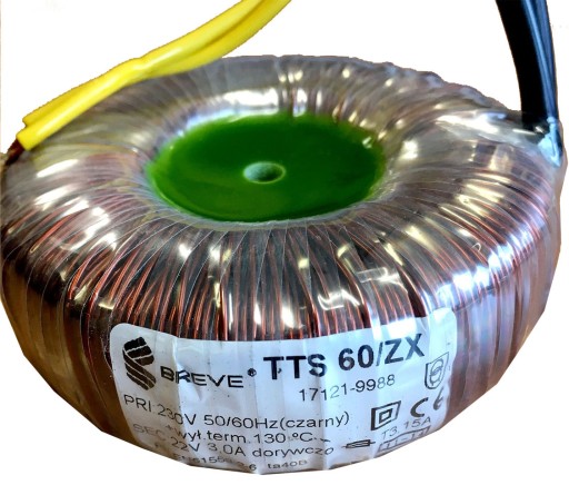 TTS 60/ZX 230/ 22V transformator toroidalny Breve przeznaczony głównie do wbudowania w układach zasilających urządzeń elektronicznych oraz zasilania niskonapięciowych systemów oświetleniowych, charakteryzujący się małymi gabarytami i masą, małymi stratami mocy oraz małym rozproszeniem magnetycznym.