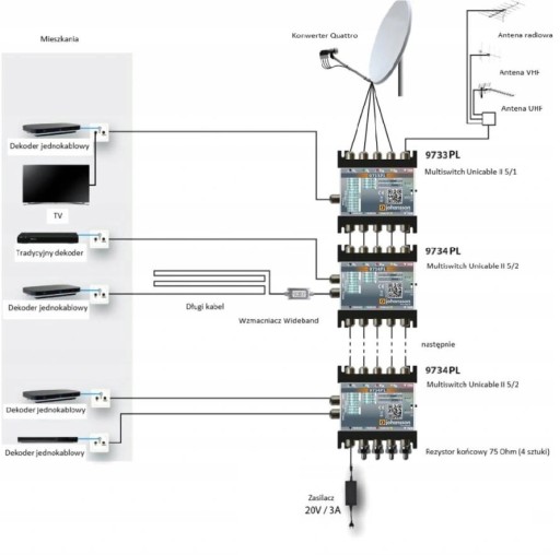 Przykładowa instalacja z wykorzystaniem Multiswitcha Johansson Unicable II: