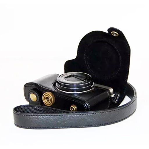 Skórzane etui z osłoną obiektywu, które chronią aparat i obiektyw, pozwalając jednocześnie na szybkie robienie zdjęć.