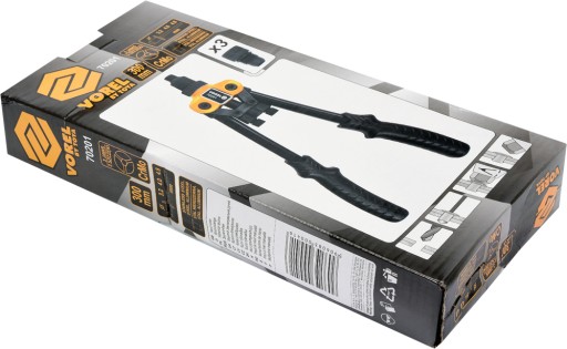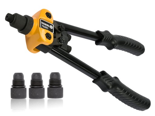 Nitownica dźwigniowa marki Vorel. Przeznaczona do obsługi nitów ze stali, stali nierdzewnej i aluminium. Obsługuje nity w zakresie: 3,2; 4,0; 4,8MM. Głowice wykonane są z wytrzymałej stali narzędziowej, chromowo-molibdenowej CrMo. Rękojeści pokryte antypoślizgową gumową okładziną.