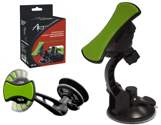 Uchwyt samochodowy ART AX-12, umożliwia umieszczenie telefonu komórkowego, smartfonu, GPS , tabletu lub innych urządzeń na szybie samochodu lub na desce rozdzielczej. Za pomocą przyssawki, można go zamontować na szybie, a za pomocą dołączonej podstawki z taśmą samoprzylepną, można go zamontować na desce rozdzielczej.