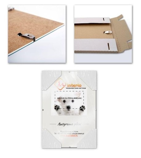 - 4 klipsy mocujące, które idealnie dociskają tworzywo plexi do płyty HDF i które również spełniają funkcję zawieszki