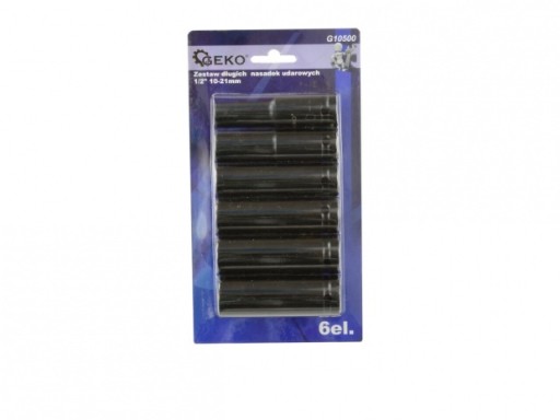 Zestaw profesjonalnych długich nasadek udarowych renomowanej marki GEKO. W skład zestawu wchodzi sześć nasadek udarowym w rozmiarach 10-21mm. Nasadki wykonane zostały z wysokogatunkowej stali chromowo-wanadowej (CRV) charakteryzującej się zwiększoną odpornością na uszkodzenia mechaniczne. Przystosowane do pracy z kluczem udarowym 1/2”.