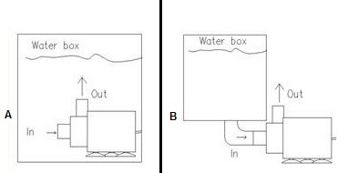 Można również pompę zamontować obok zbiornika wody (przykład B) i też pamiętać o filtrze. Wtedy łącznik od zbiornika do pompy powinien być jak najkrótszy i możliwie dużej średnicy.