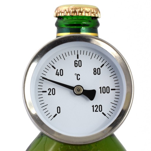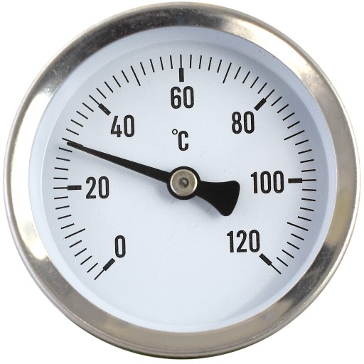 Termometr mechaniczny, bimetaliczny, przylgowy, montaż na rurę o średnicy od 1/2 do 2”, zakres pomiarowy 0-120°C, sprężyna montażowa w zestawie, średnica tarczy 63 mm. Najczęściej stosowany w systemach grzewczych, parowych, wodociągowych.