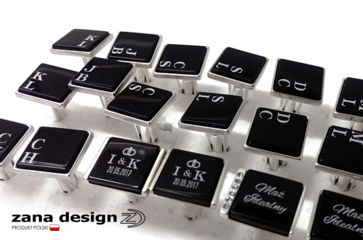 Podczas składania zamówienia w rubryce„ wiadomość dla sprzedającego” wpisz numer czcionki oraz inicjały na Lewej i Prawej spince. Grawer może być inny na L i P spince.